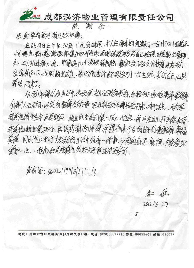 2012年8月27日上午10:30左右,溫江分公司在管項目學府美地設施設備維養(yǎng)處維養(yǎng)員張麟同志在小區(qū)內(nèi)正常工作巡視中拾到一臺價值幾千元的筆記本電腦,立即交到公司妥善保管。失主獲悉,前來辦理了相關手續(xù)后認領,感動之余當即寫了一封感謝信表達感激和贊揚。